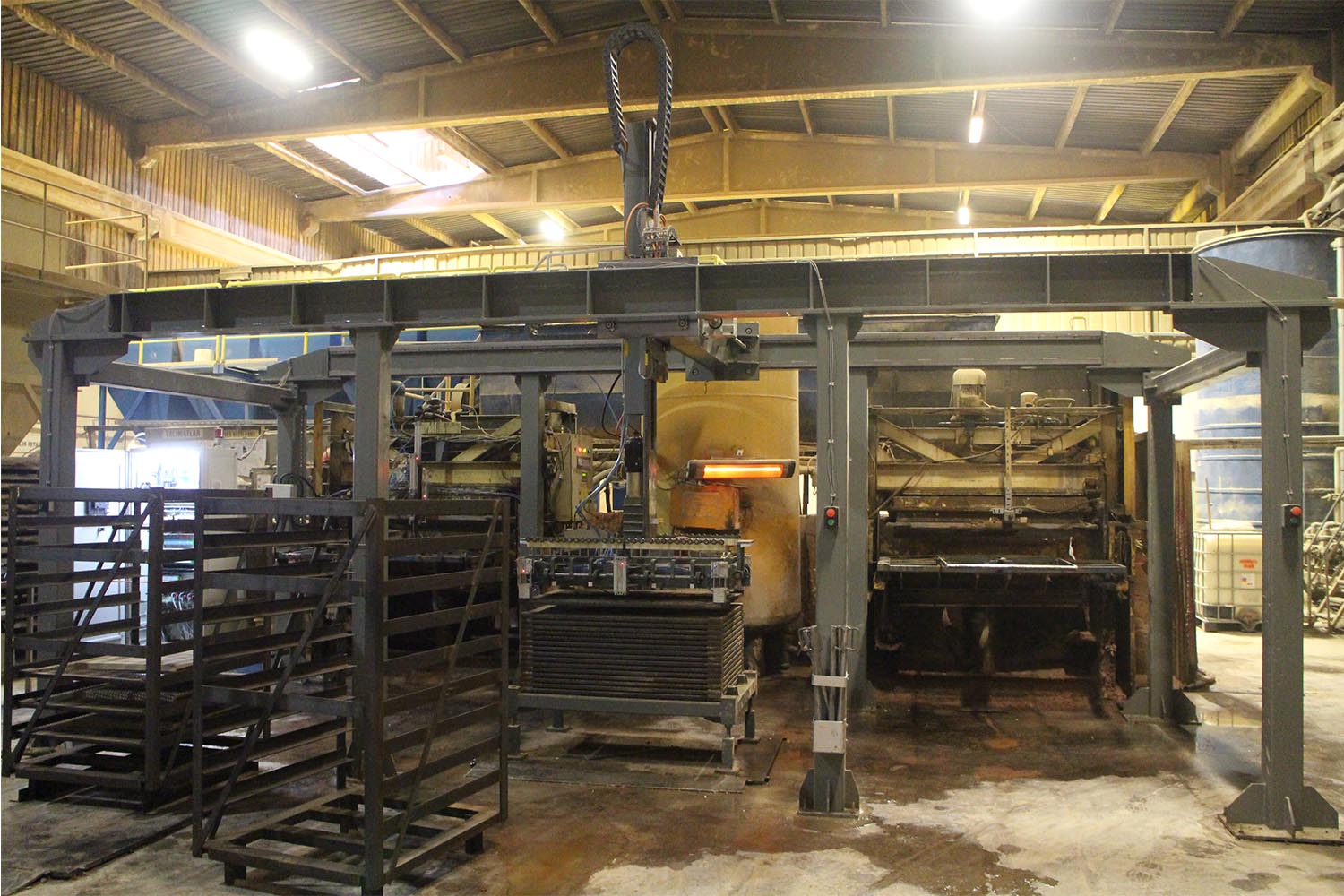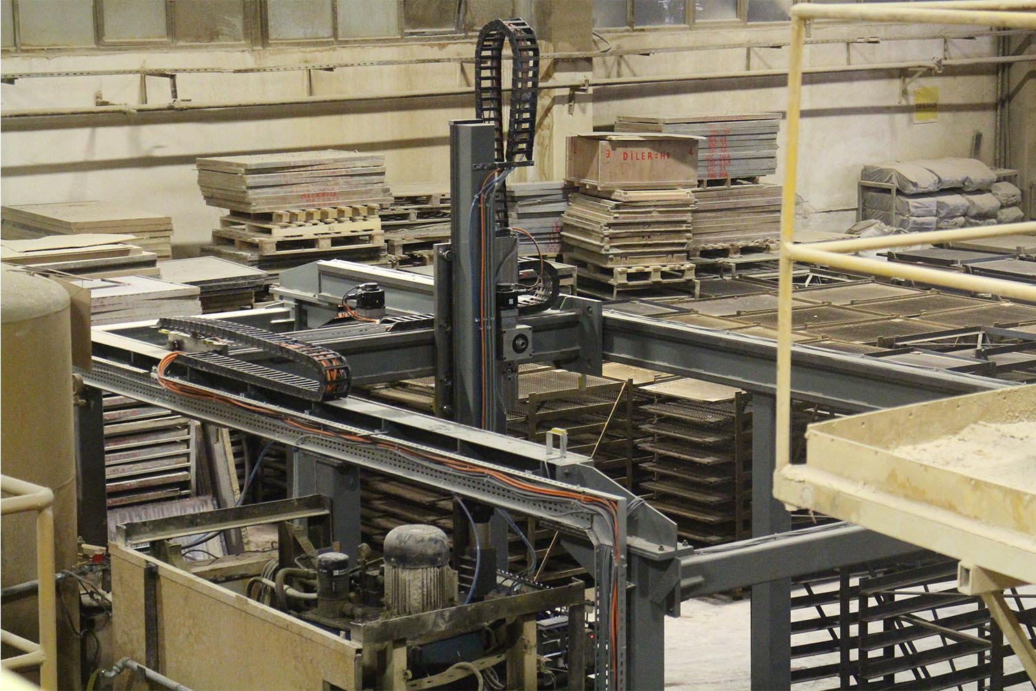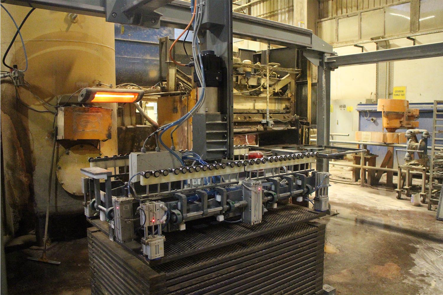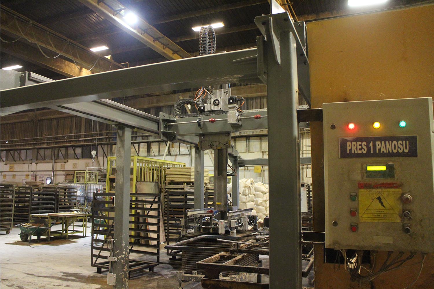Sistem pres makinelerinde hazırlanan ve ağırlıkları 50 ila 120 kilo arasında değişen ürünleri pres makinelerinden alarak arabalara otomatik olarak dizmektedir.