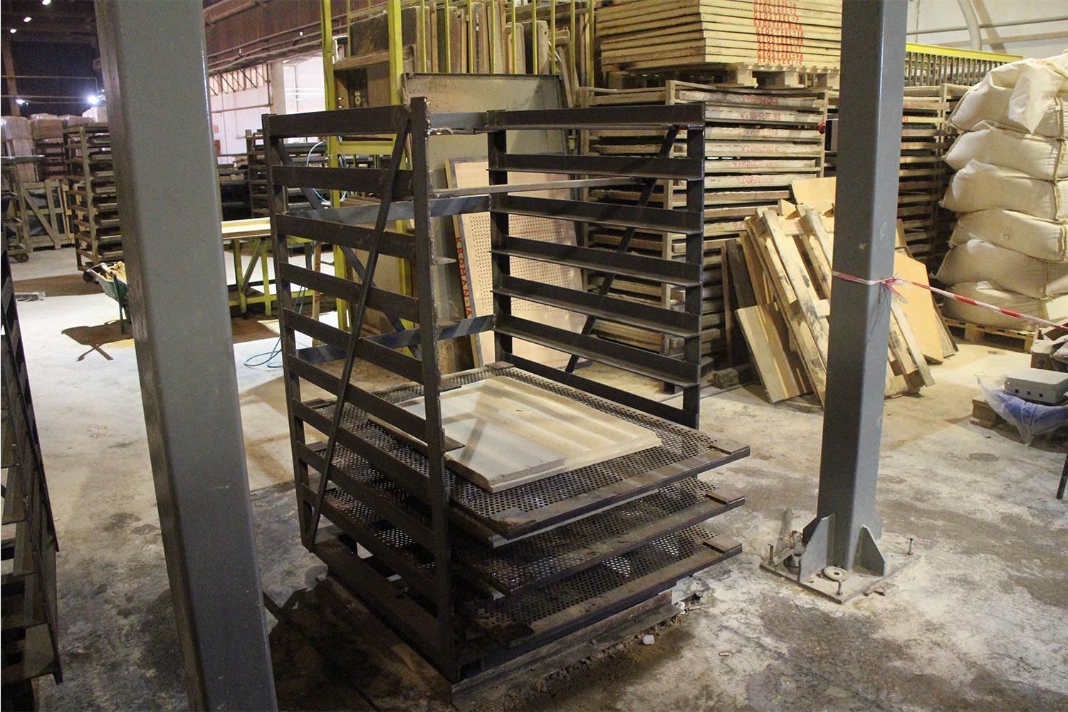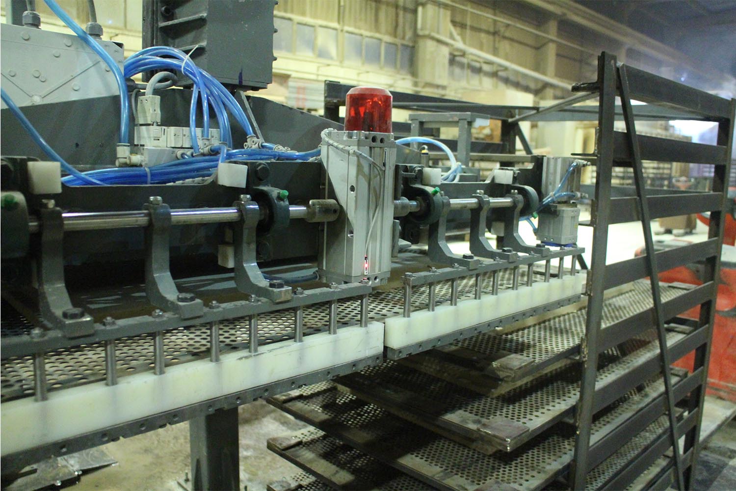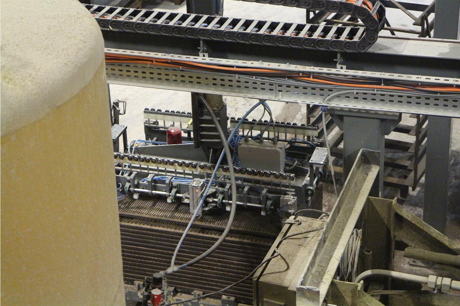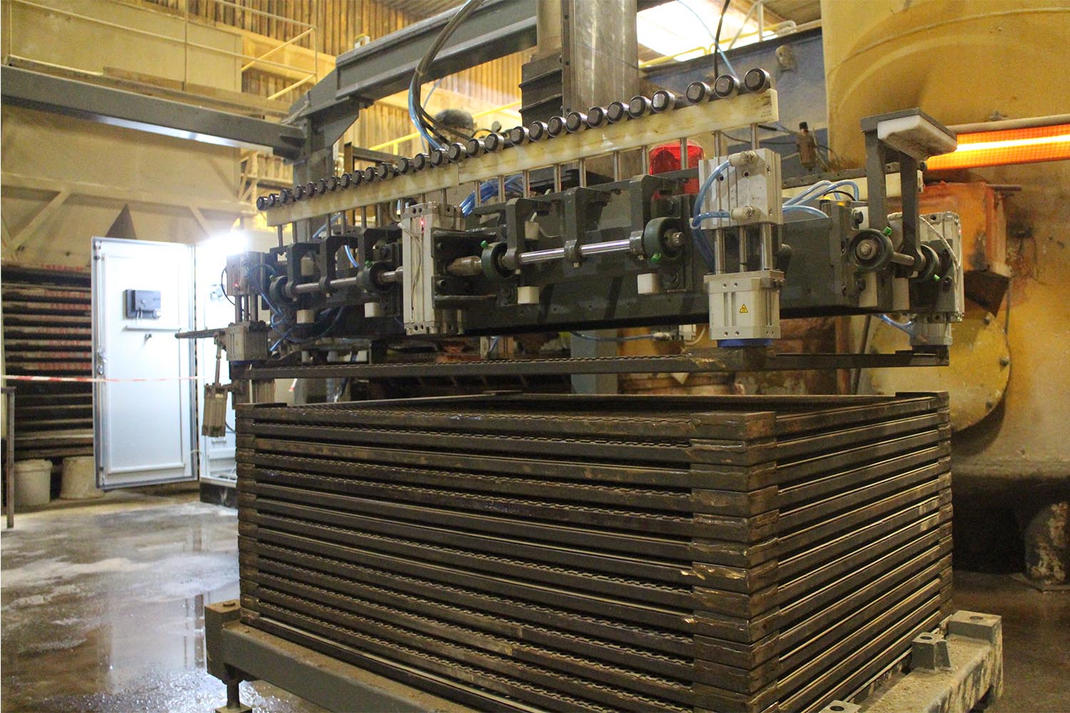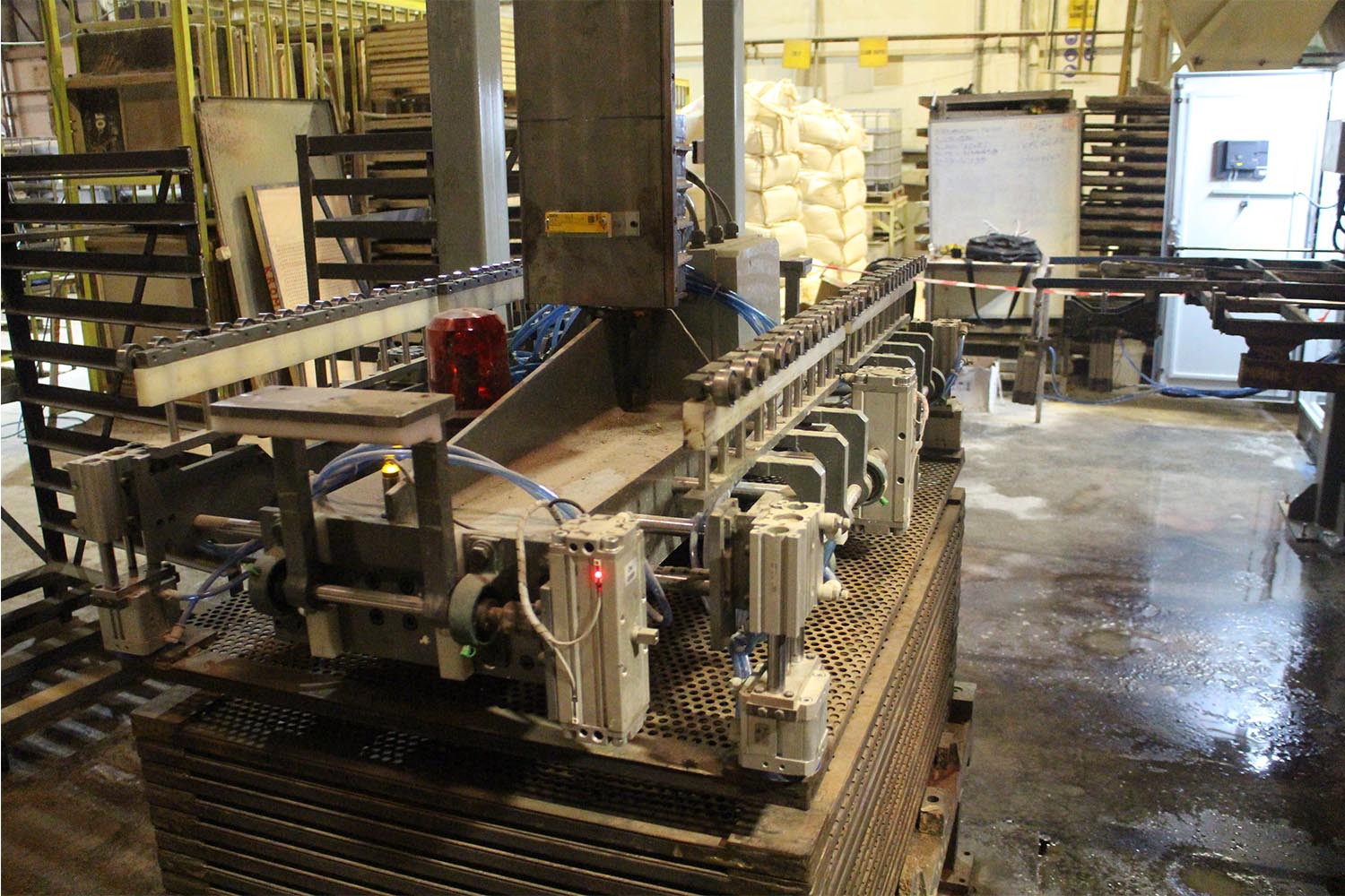 Sistem pres makinelerinde hazırlanan ve ağırlıkları 50 ila 120 kilo arasında değişen ürünleri pres makinelerinden alarak arabalara otomatik olarak dizmektedir.